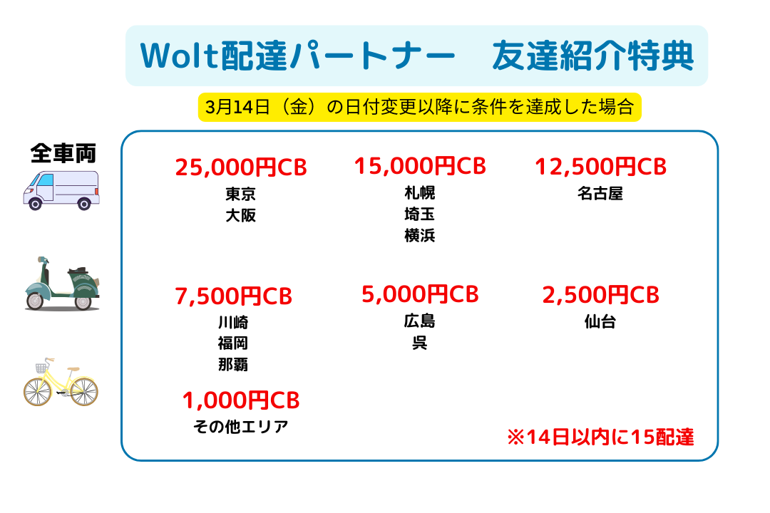 | 条件① | 1. 紹介コード「WRC264375」を入力してWolt配達パートナーに登録 2.アカウント新規有効化日から30日以内に5配達 |